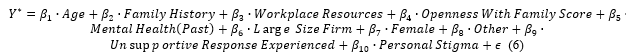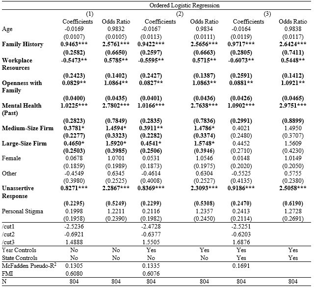 Considering these characteristics, Table 10 presents the regression estimates. The findings indicate that statistically significant explanatory variables are associated with family history, access to workplace resources, past mental health disorder history, openness with family, unsupported response experiences, and the size of the respondent’s firm.
