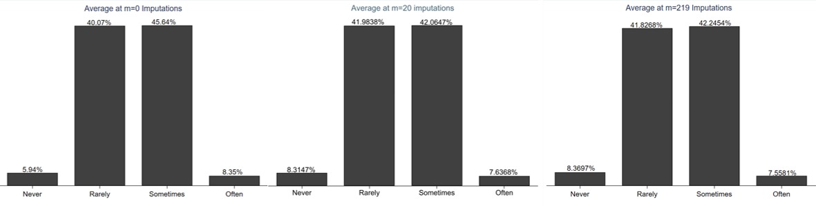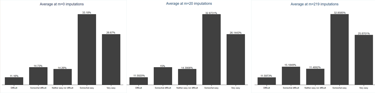 Where CV (se) is a coefficient of variation interpreted as the percentage by which we would be willing to see the SE estimate change if the data were imputed again. In this case, a maximum change of 5% was allowed, and it was found that 199 more imputations were needed to achieve the conditions imposed previously. So, the total number of imputations used in this study was 219, and the final number of observations was 804.