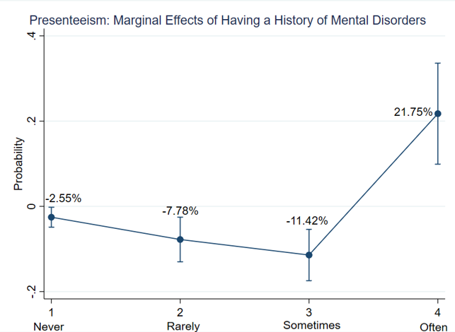 Additionally, ceteris paribus, having a history of mental disorders corresponds to a 21.75 percentage point increase in the probability of experiencing Presenteeism 'often.' Nonetheless, results in Figure 10 suggest that this increase may primarily reflect worse conditions for people who initially reported having Presenteeism episodes 'sometimes.' Consequently, individuals who did not experience Presenteeism when dealing with previous mental health disorders are not necessarily expected to face productivity losses at the workplace if they encounter future mental health issues.