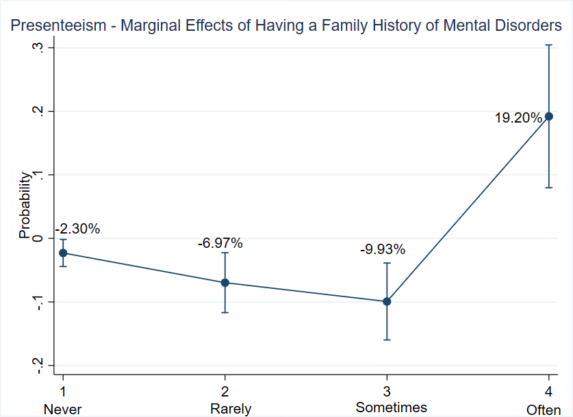 Equally important, Figure 11 demonstrates that, ceteris paribus, a family history of mental disorders is associated with a 19.20 percentage point increase in the probability of experiencing high levels of Presenteeism. Like the previous result, this increase appears to stem from worse conditions among individuals who initially exhibit moderate levels of Presenteeism. Specifically, the odds ratios indicate that, on average, the likelihood of experiencing Presenteeism 'often' or 'sometimes' is 2.64 times higher than the likelihood of experiencing it 'rarely' or 'never' for workers with a family history of mental illness. These results suggest support for the hypothesis that having family members with mental disorders may lead workers to internalize stigma and feel compelled to conceal their mental health struggles