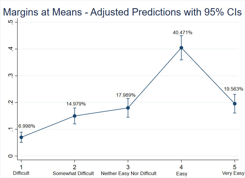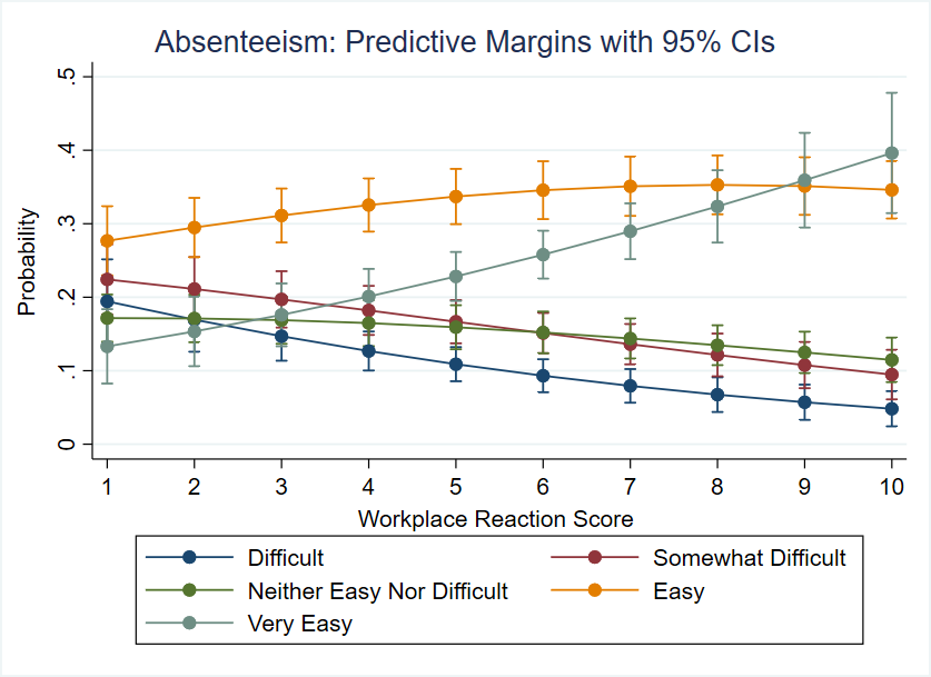 Similarly, ceteris paribus, the estimates suggest that marginal increases in the perceived workplace reaction score assigned to the employer are associated with an increased probability of higher levels of Absenteeism, thereby reducing the chances of low and moderate Absenteeism, as shown in Figure 5. Specifically, odds-ratios showed that, in average, the probability of experiencing Absenteeism "Easy" or "Very Easy" are 19% higher than experiencing it "Difficult" or "Somewhat Difficult" when the grade of positive reaction within workplace increases by one point.
