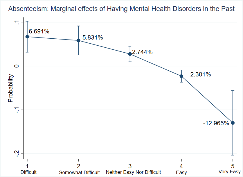 Results suggest that individuals who discuss their conditions with others may exhibit a tendency to overcome personal stigmas around mental disorders and are more likely to request absence leaves to seek therapy. Finally, Table 8 shows that medical coverage of mental health services is associated with a 97% higher probability of finding absences 'Very Easy' and 'Easy' (versus 'Difficult' and 'Very difficult'). These findings suggest that access to insurance programs is associated with a higher likelihood of individuals seeking help when unwell and requesting leave to attend therapy sessions