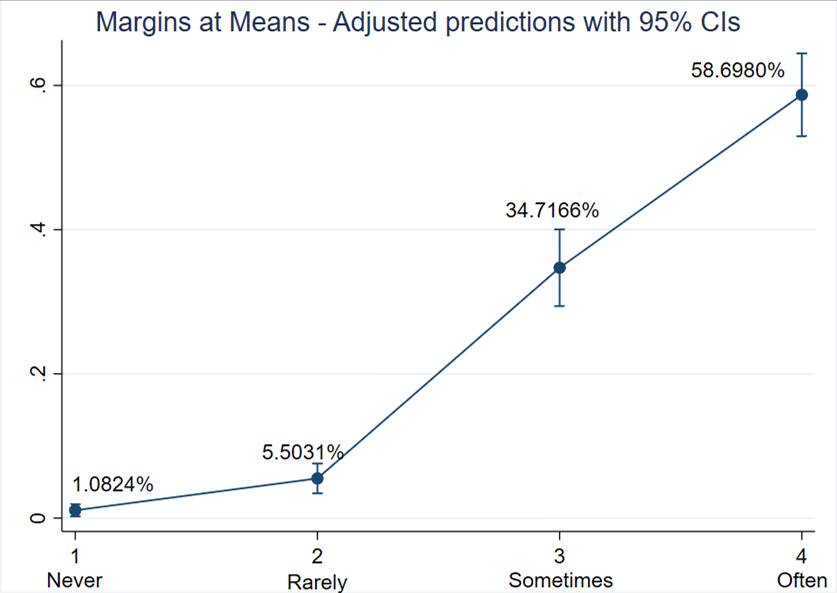 When comparing the three ologit models, the highest sensitivity and specificity were achieved in Model (3), which incorporates both survey year and state controls. Consequently, the subsequent estimation of margins will rely on Model (3), while coefficients and odds ratios for all models are provided for readers to conduct further analysis.