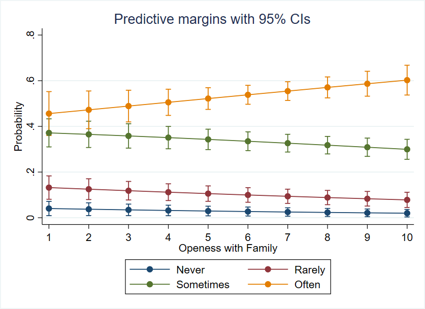 Similarly, ceteris paribus, estimates show that increases in an employee’s openness with family and friends are associated with a higher likelihood of experiencing higher levels of Presenteeism (thus reducing the chances of low Presenteeism), as illustrated in Figure 9. Specifically, odds ratios showed that, on average, the probability of experiencing Presenteeism episodes 'Sometimes' or 'Often' is 9% higher than experiencing them 'Rarely' or 'Never' when the grade of openness with family increases by one point. This finding aligns with the findings of Fiorini [32] and Vera-Calzaretta [33], where overwhelming family environments were linked to recurrent Presenteeism episodes. Nonetheless, over-reliance on family may lead individuals to use conversations with their inner circle as the primary outlet for addressing mental health issues, rather than seeking therapy. This potential confusion between openness and problem resolution could contribute to unresolved mental health issues and an increased frequency of Presenteeism episodes.