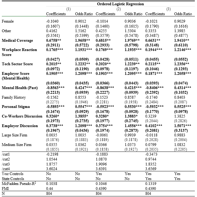 Before explaining the estimation results, it is important to highlight that the sample was obtained from voluntary employees who took the OSMI survey online, such that a self-selection bias component is present. Additionally, sampling weights were not available, so statistical inference for the entire population of U.S. is limited, since labor supply and demand of the tech sector, are not homogeneous in all States.