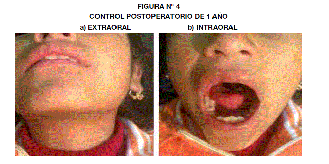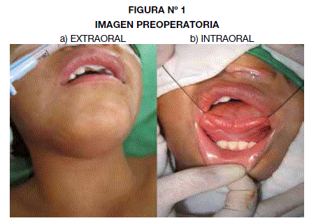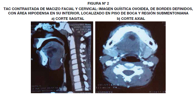 Paciente de sexo femenino, de 9 años de edad, acude a consulta externa de Cirugía Maxilofacial del Hospital del Niño "Dr. Ovidio Aliaga liria" de La Paz en compañía de su madre, con cuadro clínico de 2 años de evolución aproximadamente, caracterizado por aumento de volumen de piso de boca y región submentoniana, de crecimiento lento, progresivo, asintomático. Niega antecedentes patológicos personales y familiares de relevancia. Al examen extraoral se evidencia asimetría facial por aumento de volumen submentoniano, de consistencia blanda, indoloro, cubierto por piel de aspecto normal; al examen intraoral se observa aumento de volumen en el piso de la boca, de aproximadamente 5 cm de diámetro, sin cambio de coloración de la mucosa oral, a la palpación blando, depresible, no doloroso, conductos salivales permeables, sin signos ni síntomas infecciosos (Figura N° 1). Se solicita exámenes complementarios: hemograma y coagulograma, cuyos resultados se encuentran en parámetros normales. Tomografia Axial Computarizada contrastada de región facial y cervical donde se aprecia: formación quística ovoidea, de 4,5 cm x 3,4 cm de diámetro mayor, de bordes definidos, con imagen hipodensa en su interior, localizado en piso de boca y región submentoniana, las estructuras anatómicas adyacentes sin alteraciones (Figura N° 2). Bajo anestesia general y mediante abordaje intraoral se realiza exéresis completa de la masa (Figura N° 3), se envía para estudio anatomopatológico cuyo reporte indica: Quiste Dermoide en piso de boca. La paciente presentó en el postoperatorio evolución favorable y no muestra datos de recurrencia transcurridos 1 año de la cirugía (Figura N° 4).