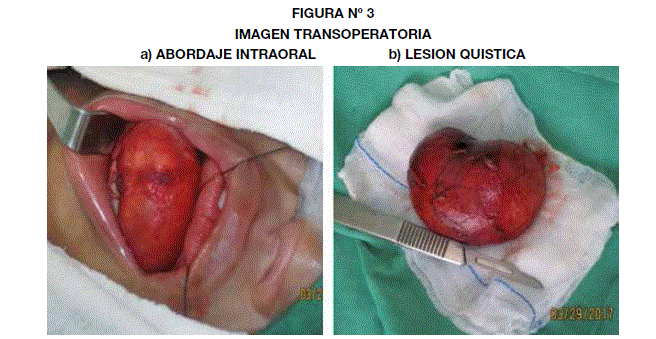 El tratamiento de elección es la enucleación quirúrgica a través de un abordaje intraoral o extraoral, que es facilitado por la presencia de una cápsula. La ubicación y el tamaño del quiste parece ser un factor determinante para el abordaje quirúrgico. La mayoría de los autores recomiendan el abordaje intraoral para el quiste sublingual, mientras que el abordaje extraoral generalmente se elige para el submandibular o submental, Grandes quistes que perforan el milohioideo pueden requerirtanto incisión intraoral como extraoral para proporcionar visualización directa de estructuras adyacentes importantes. Las recurrencias son inusuales después de la escisión quirúrgica absoluta. Nosotros realizamos un abordaje intraoral, pese al compromiso también extraoral, con resultados estéticos y funcionales excelentes. La transformación maligna es extremadamente rara. El más común es el carcinoma de células escamosas y solo se ha documentado en la variante Teratoide10,11,12.