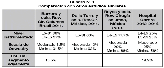La fusión y/o artrodesis es un procedimiento ampliamente aceptada en varios países desarrollados y la realización de este tipo de cirugías se han incrementado exponencialmente en las dos últimas décadas. Por otro lado diversos estudios similares indican que la artrodesis postero-lateral ha mostrado un alto índice de éxitos y un bajo porcentaje de pseudoartrosis si se complementa con fijación transpedicular.5