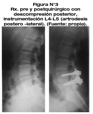 CONCLUSIONES: Se realizaron técnicas quirúrgicas descompresivas: laminectomia, foraminectomia con instrumentación. El índice de discapacidad de Oswestry permite valorar que la técnica fue efectiva debido a que los pacientes presentan una evolución funcional sin limitaciones en su vida cotidiana en la mayoría de los casos.