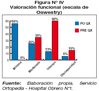 RESULTS: According to Oswestrydesability index, 56% of the patients have minimal functional limitation and 6% of disability at 6-month postoperative. The most affected gender were females with 57%, the average age was 64 years, prior time to surgical treatment was more than 12 months in 63%, and the most frequent instrumented levels were L3-L5 and L5-S1 with 25%.