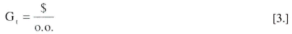 La primer relación del sistema monetario es, entonces, la paridad peso/oro (Gt). definida como la cantidad de pesos que pueden cambiarse libremente por una onza de oro en un período dado. La dimensión de esta relación es la siguiente: