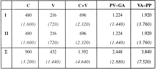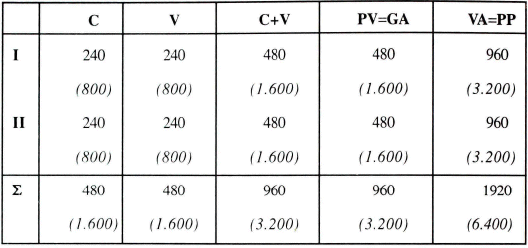 Los números de la primer línea de cada sector del cuadro 1 están medidos en pesos, mientras que aquéllos entre paréntesis están medidos en jornadas de trabajo, (El cálculo de estos últimos se expondrá más adelante). Nótese que, como los precios = valores. en cada sector el plusvalor (PY) producido es igual a la ganancia apropiada (GA), y el valor objetivado (YA) es igual al precio de producción (PP). La tasa estacionaria o nominal de ganancia es