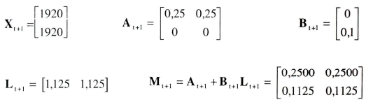 Así, en el período t+1, los capitalistas adoptan de manera uniforme en ambos sectores una innovación ahorradora de trabajo vivo20. El producto físico y el uso de medios cle producción se duplican, pero sólo se ocupa un 90% del trabajo vivo del período t: Lt+1Xt+1 = 4.320, en lugar de LtXt = 4.800 jornadas de trabajo. Por otra parte, el salario real se mantiene constante. Las matrices y vectores que describen la economía en t+1 son, entonces, los siguientes: