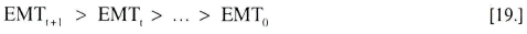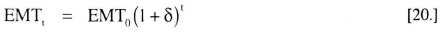 La EMT correspondiente al trabajo vivo puede definirse como la relación entre el producto de valor (precio en pesos del producto neto Yt) y el trabajo vivo total LtXt. En condiciones estacionarias, este cociente es igual a la EMT correspondiente al tiempo de trabajo total objetivado en la economía. Por tanto, la EMTt puede calcularse del siguiente modo: