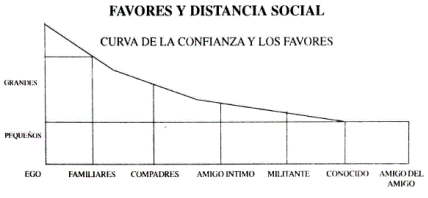 Estos estratos de clase, después de la LPP, se concentran en el poder administrativo de los municipios como un medio para perpetuar su existencia. Se reproduce así en las comunidades, lo que Lariza Lomnitz llama escala mental de favores influida por la distancia social (ver la figura 1).