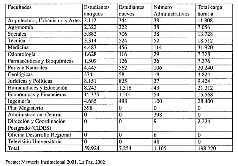 Solamente para referencia, en la UMSA existen más de 67.178 estudiantes, de los cuales cerca del 11% es nuevo. De esta población estudiantil, se titulan 2.596 profesionales cada año, de los cuales no se tiene datos precisos acerca de su empleo u ocupación. La UMSA es una de las pocas entidades que mantiene empleado's a 1.165 administrativos, cifra casi similar a la de docentes. Pese a ello-, muchas gestiones administrativas y financieras son lentas, morosas y decepcionantes. La memoria del 2001 no consigna datos sobre el número de docentes que tiene la UMSA, aunque se sabe que la carga horaria total asciende a 198.720.