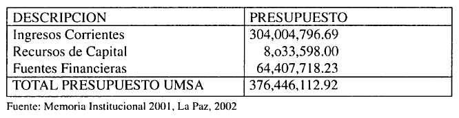 En la gestión 2001, el presupuesto de ingresos tuvo las siguientes características, en bolivianos: