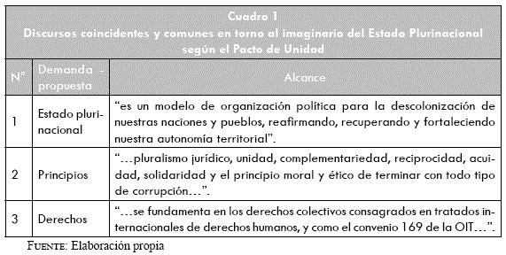 La reconstrucción, entrelazamiento12 y expansión de un discurso coincidente y común se sintetiza luego en el documento presentado por el Pacto de Unidad elaborado para la Asamblea Constituyente. Documento que expone un conjunto de principios y valores que definen un tipo ideal de Estado Plurinacional, desde las naciones subalternizadas (Tapia, 2015). Manteniendo las demandas propias de cada nación indígena, los elementos coincidentes y comunes que expone el documento del Pacto de Unidad (Ver Cuadro 1) para el proceso constituyente advierte un matiz estrictamente político (como sujetos políticos).