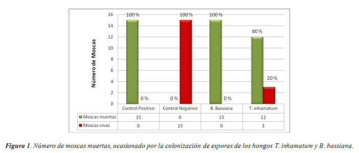 En la figura 1, se aprecia los resultados de la actividad insecticida de los hongos T. inhamatum y B. bassiana, luego de haber aplicado un inoculo de esporas a una concentración de 6,0 x 106 propagulos / mi, sobre la mosca de la fruta D. melanogaster. En la misma se evidenció que ambos hongos poseen actividad insecticida, sin embargo, si estas actividades son comparadas con el control positivo, observamos que el hongo B. bassiana, posee una mayor efectividad como insecticida, logrando un número de 15 moscas muertas (igual al control negativo); En tanto que el hongo T. inhamatum solo alcanzó a colonizar 12 moscas.