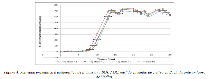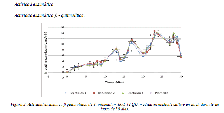 En el análisis enzimático realizado a las dos cepas de estudio, se observó que los hongos T. inhamatum y B. bassiana, presentan actividad quitinolítica, la mejor actividad enzimática quitinolítica se observó a los 14 días, por el hongo B bassiana con una actividad promedio de 70,71 mU/mt/min (Figura 4), con respecto al hongo T. inhamatum, la mejor actividad reportada, se observa a los 24 días con una actividad promedio de 13,78 mU/mt/min (Figura 3), posterior a este resultado, se observa un descenso en la actividad enzimática.