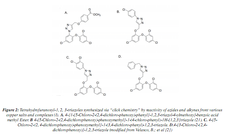 The elements above-mentioned motivated us to initiate an extensive investigation in order to explore the possibility to use 1,2,3-triazoles as novel antifungals. The aim of this study was to evaluate the susceptibility of Candida albicans ATCC 10231 to tetrahydrofuranosyl-1, 2, 3-triazoles obtained via "Click chemistry".