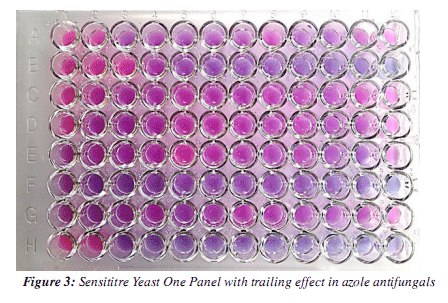 This system is based on a technique of RPMI 1640 glucose broth microdilution. It contains an indicator of redox growth, which detects pH variations (Alamar blue), allowing the determination of in vitro sensitivity, and by colorimetric changes also quantifies different triazoles, including fluconazole. The steps were the next: