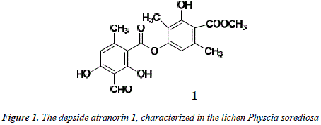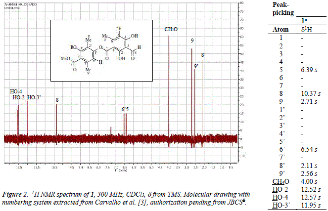 Lichens are vegetal organisms generated by the symbiosis of algae and mushrooms [1]. They synthesize secondary metabolites as depsides, terpenoids, acids, quiñones, chromones, xanthones and anthraquinones [2]. In our study of the lichen Physcia sorediosa, collected in the main campus of UMSA in La Paz (3600 m.a.s.L), we have isolated the depside atranorin 1, see Figure 1. The structure was assigned by analysis of the 1H NMR and 13C NMR data of compound 1 (Fig. 2 and 3, Table 1) in comparison with those published in the literature for atranorin [3].