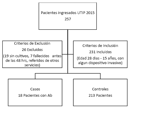 El año 2015 se internaron en el servicio de UTIP 257 pacientes, de los cuales se excluyeron 26 (19 no contaban con cultivos, 7 fallecieron durante el 1er día) quedando 231 incluidos para el análisis; se aisló Acinetobacter baumannii en 18 pacientes (17 pacientes con el germen en el aspirado traqueal, uno en líquido cefalorraquídeo y por último uno en líquido pleural) (ver flujograma, Figura 3).