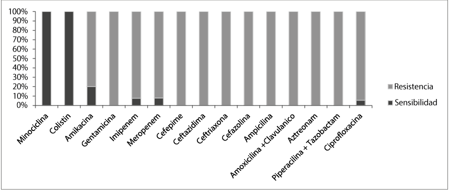 Así mismo se observa un patrón multiresistente, con sensibilidad solo al colistin y minociclina; y de forma intermedia a la amikacina, ciprofloxacina e imipenem (Figura 2).