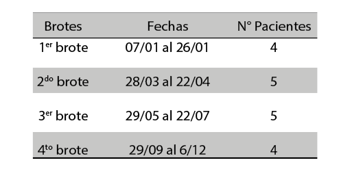 La incidencia de infección por Acinetobacter baumannii fue de 7,8 pacientes de cada 100 internados (Figura 1); con la característica de presentarse en brotes, se identificaron cuatro brotes a lo largo del año (Tabla 1), con una mayor incidencia en los meses de enero a abril (verano – otoño).