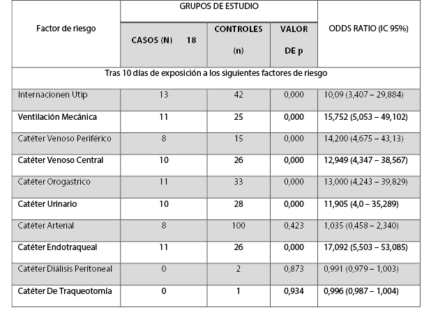 Valorando los factores de riesgo tras 10 días de exposición, los se asocian a infección por Acinetobacter baumannii se pueden observar la Tabla 2.