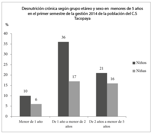 Conclusions: chronic malnutrition in children less than 5-year-old, attending the Tacopaya outpatient Health Center, reached 16,2% in 2014, showing higher prevalence in boys than in girls. Children up to 1 year to less than 2 years were the most affected. Malnutrition remains a serious problem still affecting the Bolivian population. This information may be useful for planning nutritional interventions aiming to reduced chronic malnutrition.