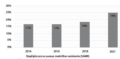 La resistencia a la meticilina del Staphylococcus aureus (MRSA) de 17 % en 2014 y 2016, aumento a 18% en 2018 y a un 25% en 2021 respectivamente (Figura 1).
