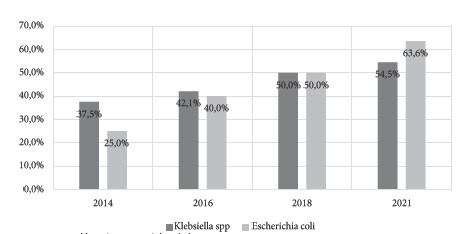 La Klebsiella spp productora de betalactamasas de espectro extendido (BLEE) de 37,5% en 2014 aumentó a 42,1% en 2016, y de un 50 % en 2018 incrementó a 54,5 % en 2021. La Escherichia coli productora de BLEE de 25 % en 2014 aumentaron a 40% en 2016, y de un 50 % en 2018 aumento a 63,6 % en 2021 (Figura 2).
