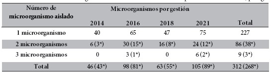 Tabla 1. Frecuencia de microorganismos aislados de los cultivos positivos analizados, por gestión