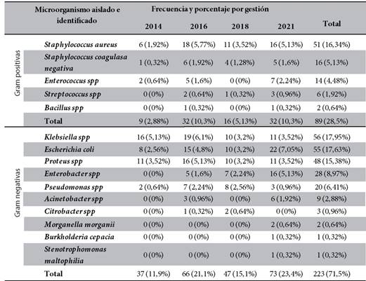 Tabla 2. Frecuencia y porcentaje de microorganismos aislados e identificados en cultivos positivos, por gestión.