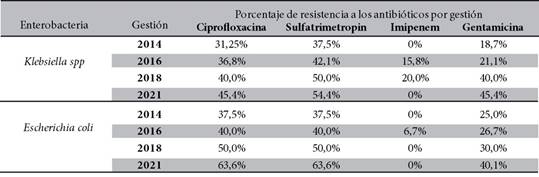 La resistencia de la Klebsiella spp a la ciprofloxacina aumento de 31,25 % en 2014 a 45,4 % en 2021, respecto al sulfatrimetoprim la resistencia incremento de 37,5 % en 2014 a 54,4 % en 2021 y la resistencia a la gentamicina de 18,7% en 2014 aumento a 45,4% en 2021. En relación con, la Escherichia coli la resistencia a la ciprofloxacina y al sulfatrimetoprim de 37,5 % en 2014 aumento a 63,6 % en 2021 respectivamente; mientras que, la resistencia a la gentamicina de 25% en 2014 se incrementó a 40,1 % en 2021 (Tabla 3).