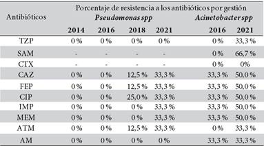 Tabla 4. Porcentaje de resistencia a los antibióticos de las Pseudomonas spp y Acinetobacter spp bacilos gramnegativos no fermentadores más frecuentemente aislados, por gestión.