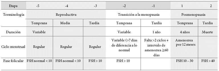 La clasificación STRAW (Staging for Reproductive Ageing Workshop) resulta de relevante utilidad para caracterizar el diagnóstico (Figura 1), y permite evaluar el envejecimiento reproductivo en contextos clínicos; ya que agrupa los ciclos menstruales, síntomas, niveles de la hormona foliculoestimulante (FSH, del inglés: Follicle-Stimulating Hormone), hormona luteinizante (LH, del inglés: Luteinizing Hormone), hormona antimulleriana, inhibina B y recuento folicular, los que cambian en relación con la etapa en la que se encuentre cada mujer: reproductiva, transición a la menopausia y posmenopausia23,24.