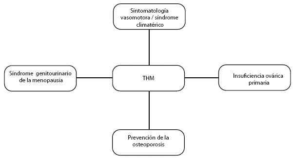 En la figura 2 se aprecia las indicaciones. Si bien la THM continúa liderando, como la terapia más eficaz para la sintomatología vasomotora y el tratamiento del síndrome genitourinario de la menopausia, también se ha revelado que protege la pérdida ósea (osteoporosis) y las fracturas45,46. Adicionalmente se pueden incluir ciertos beneficios como: mejora en los trastornos del sueño, cambios de humor, disfunciones sexuales y, en general, de la calidad de vida47,48.
