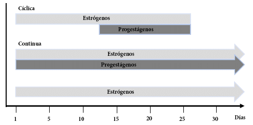 La THM se puede administrar con solo estrógenos (estradiol [E2], estrógeno conjugado [CEE] y etinilestradiol [EE]) en mujeres sin útero y la combinación de estrógenos más progestágenos (progesterona [natural] o progestágeno [sintético]) en mujeres con útero, a fin de prevenir de forma efectiva la hiperplasia y el carcinoma endometrial, ya que el estrógeno sin oposición incrementa el espesor del revestimiento uterino y aumenta el riesgo de cáncer de endometrio50-52. Existen tres formas frecuentes de usar la THM: a) estrógeno solo, combinada continua (estrógeno y progestágeno diario) y combinada cíclica (estrógeno y progestágeno del 12 - 14 al día 28 del ciclo) (figura 3).