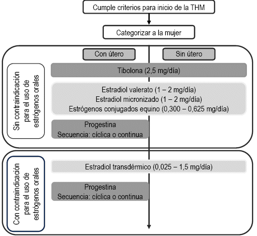 En la figura 4 se detalla el algoritmo de abordaje de la mujer con criterios para recibir THM. En ausencia de contraindicaciones, se ha de determinar el tratamiento con más beneficios clínicos y menos riesgos añadidos para cada mujer; haciendo la diferenciación entre las que tienen o no útero y las con eventuales contraindicaciones para la terapia oral; haciendo uso de la “medicina de precisión” y del manejo holístico centrado en la persona64,65.