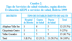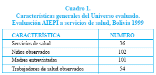 La evaluación se realizó durante el mes de abril de 1999 en los distritos de salud de Altiplano Valle Sur en La Paz, Valles Cruceños y Chiquitania Centro en Santa Cruz. Los cuadros 1 y 2 muestran las características generales del universo evaluado y los tipos de servicios de salud visitados. Se visitaron 36 de los 40 servicios originalmente programados.