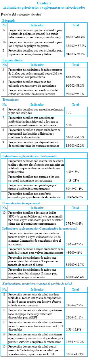 Con los resultados obtenidos se calcularon los indicadores recomendados por el Grupo Técnico de Trabajo Interagencial de Monitoreo y Evaluación AIEPI, que incluyen 15 indicadores principales y 15 suplementarios divididos en tres áreas: habilidades en el desempeño del personal de salud (búsqueda de signos/síntomas, examen clínico y tratamiento); comunicación interpersonal y apoyo al servicio de salud (equipamiento y suministros). En el cuadro 3 se presentan los principales indicadores y los valores encontrados.