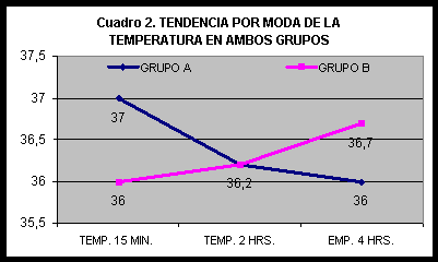 En el grupo A, dentro de los 15 minutos, algo mas de la mitad de los neonatos tienen temperatura de 36,5ºC o mayor, a las dos horas solo un 50% tiene esta temperatura considerada normal; sin embargo a las 4 horas la mayoría de pacientes en este grupo tienen un valor de temperatura normal. En tanto que en el grupo B, dentro de los 15 minutos la mayoría tienen una temperatura de 36,5ºC o mayor, a las dos horas menos de la mitad tienen temperatura igual o mayor a 36,5ºC, y a las 4 horas algo mas de la mitad de neonatos tienen un valor de temperatura considerado normal. Cuadro #1.