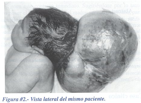 Recién nacido del sexo femenino que ingresó a la unidad de neonatología por presentar una tumoración gigante en la región occipital. Nació a las 40 semanas de gestación por cesárea debido a desproporción céfalo-pélvica, con un peso de 4000 g, talla de 55 cm y perímetro cefálico de 40 cm, de una madre de 30 años de edad sin cuidado prenatal, ni antecedentes importantes de patología materna o perinatal. El examen físico destacó la presencia de una tumoración gigante de aproximadamente 30 x 40 cm de diámetro con una superficie lisa y brillante, ubicada en la región occipital. Figuras # 1 y 2.