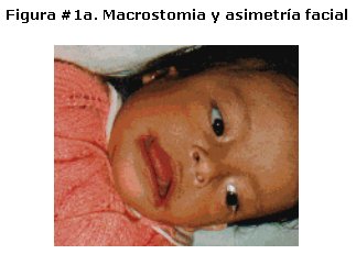 Parto domiciliario sin control perinatal, se ignora el peso al nacimiento. Al examen físico se constató una asimetría facial, muesca o escotadura labial en el lado derecho, apéndices preauriculares en ambos lados y macroglosia. Figura # 2a.