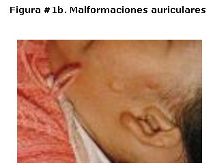 Caso Nº 1. Paciente de sexo femenino de 1 año de edad que llegó al servicio de pediatría por presentar un cuadro de laringitis. La niña fue producto de un embarazo normal con controles prenatales rutinarios, parto eutócico sin complicaciones neonatales, con peso al nacer de 2900 g. Al examen físico se observó en ojo derecho un dermoide conjuntival, pabellones auriculares asimétricos, microtia, estrechez del conducto auditivo externo, apéndices preauriculares del lado izquierdo y macrostomía por la presencia de muescas o escotaduras labiales bilaterales; como se observan en las figuras #1a y 1b. El estudio radiológico de columna mostró la presencia de vértebras cervicales supernumerarias.