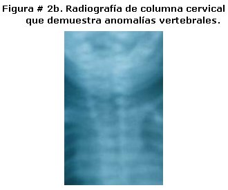 En el estudio radiográfico de columna cervical se observó hemivertebras en C3 y C4, así como cierre incompleto de los cuerpos vertebrares cervicales en C2, C3, C4, C5. Figura # 2b.