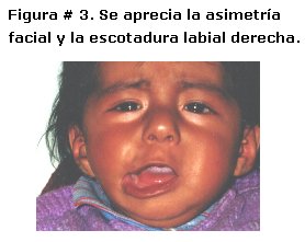 Al examen físico se evidenció una asimetría facial, escotadura labial en el lado derecho, apéndices preauriculares del mismo lado e hipoplasia del maxilar superior, como se aprecia en la figura # 3.
